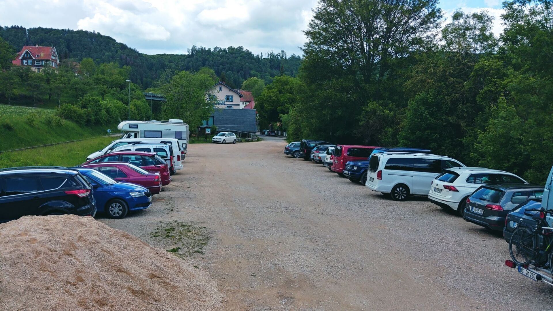 Wieder am jetzt leeren Parkplatz angekommen können wir noch einmal einen Blick auf den über dem Tal thronenden Petersfelsen geniesen.