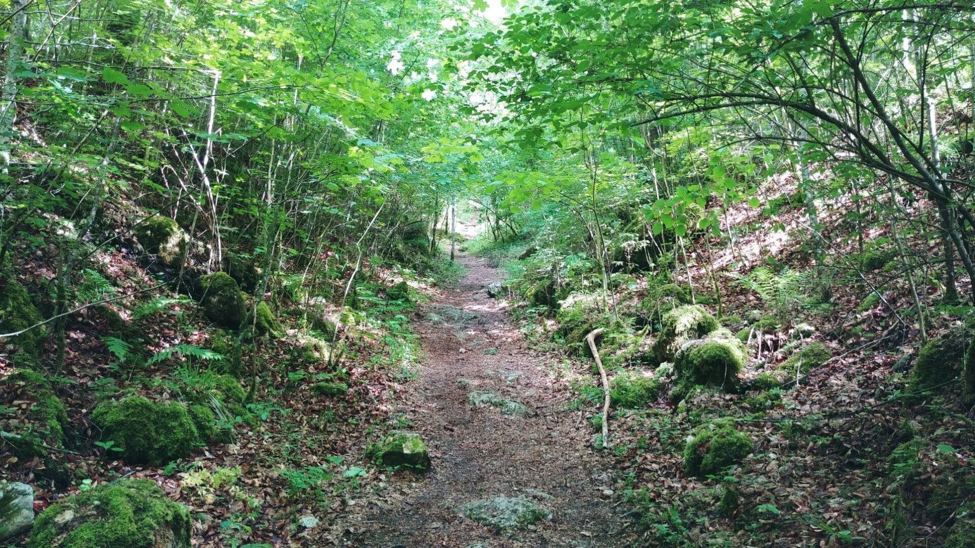 Von oben kommend biegen wir wieder am Wanderweg angekommen rechts ab und folgen dem Weg.